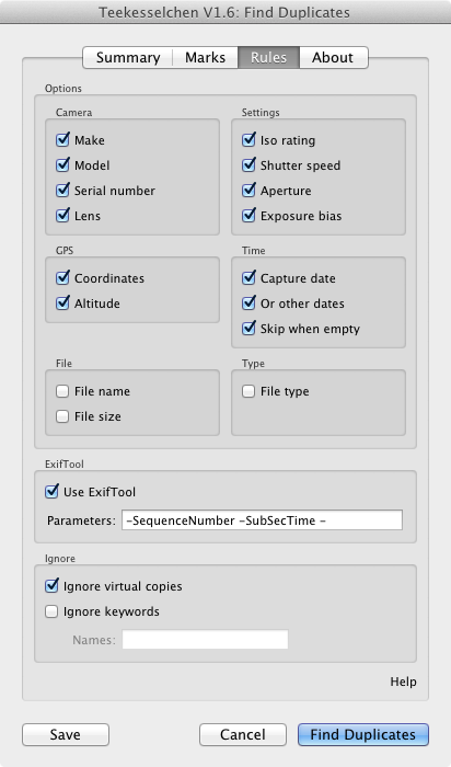 This tab allows you to select the meta-data fields and to define the exclusion criteria. Teekesselchen uses the selection to determine duplicates. Sometimes this plug-in marks photos as duplicates which are none, e.g. photos from a continuous shooting with an equal timestamp. In this case you should define a keyword for photos which Teekesselchen has to ignore. Add this keyword to the specific photos and remove the keyword for duplicates. These photos will never be marked as duplicates again.